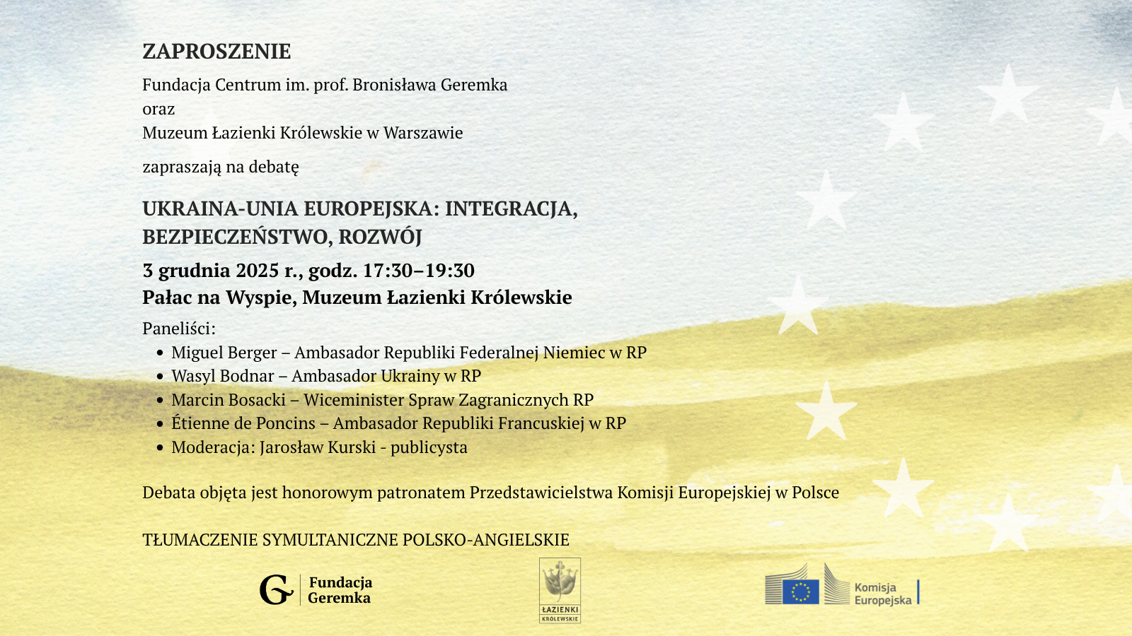 Fundacja Centrum im. prof. Bronisława Geremka wraz z Muzeum Łazienki Królewskie w Warszawie zapraszają na debatę poświęconą przyszłości Ukrainy w kontekście integracji z Unią Europejską. Wydarzenie odbędzie się 3 grudnia 2025 r. w Pałacu na Wyspie w Muzeum Łazienki Królewskie w godzinach 17:30–19:30.